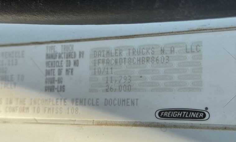 2012 Freightliner M2 Business Class M2 106 4X2 Chassis, Approximately 130,021 Miles and 1,883 Engine Hours, Cummins ISB 6.7L Diesel Engine, Automatic Transmission, A/C, Cruise Control, Hydraulic Brakes, Engine Block Heater, Spring Suspension, 26,000 GVWR, VIN 1FVACWDT8CHBR8603. Non-CDL Truck